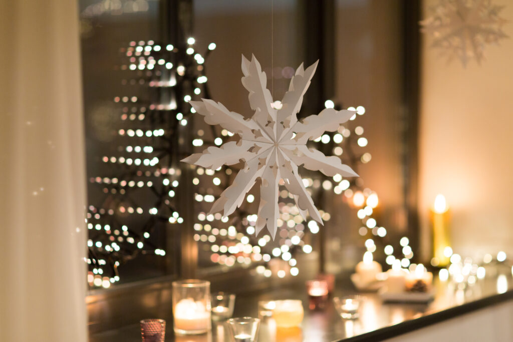 Sometimes it’s fun to just walk around town and see how the shops are decorating their windows and front displays. This can give you inspiration and ideas for your own holiday preparations. For example, you could hang a few glittery stars above a dining room table to create aesthetic interest and appeal for your guests. For larger homes, an oversized indoor wreath is an eye-catching focal point in the room.